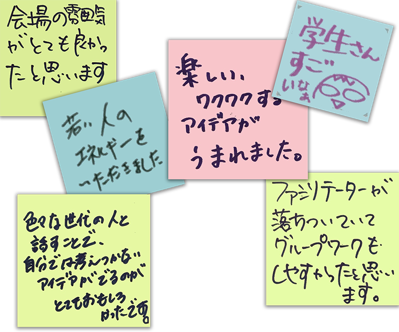 これまで「公共交通機関」「空きビル有効活用」「地元食材」など、毎回テーマを変えて話し合いました。グループごとに意見がまったく違うのは、新鮮でおもしろいですね。今後は、その中で生まれたアイデアを、実際にカタチにしてみたいとも思っています。